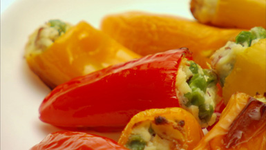 Using a paring knife, cut 1/2-inch from the stem-end of the peppers. Remove the seeds and veins. Using a small dessert spoon, fill each pepper with the ricotta mixture. Place the filled peppers on the prepared baking sheet and bake for 15 to 18 minutes until the peppers begin to soften. Cool for 10 minutes.