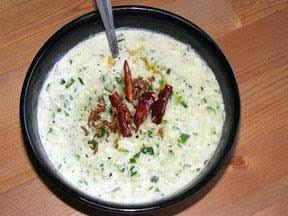 Add cucumber to yogurt and water. Roll cumin seeds to a powder and add. Add coriander and spices.