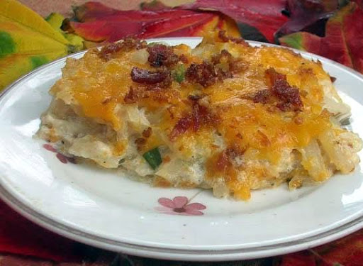 Pour over layers and bake at 350 degrees for 45-50 minutes (may take up to 2 hours if frozen). Check by pulling apart center of casserole - if still milky continue to cook another 5 minutes, etc.