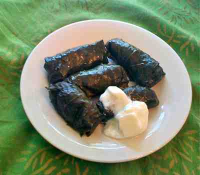 To stuff leaves, place a Tablespoon of the rice and lamb mixture on each leaf. Beginning with the stem end, roll the leaf up over the filling, then fold in each side halfway to the center, and then finish rolling from the bottom upward so you have a nice cigar-shaped package by the time you reach the top. Keep them snug, but do not roll too tightly, since the filling will expand while cooking.