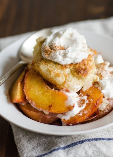 To serve, either serve the biscuits on top of the peaches, like a cobbler, or split each biscuit and fill with fruit and cream.