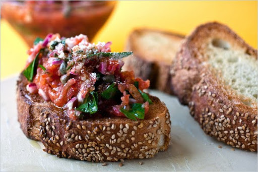 Cut the tomatoes in half at the equator, and grate on the large holes of a box grater set in a wide bowl. Combine the grated tomatoes with the vinegar, capers, garlic, onion and dill or parsley. Season with salt and pepper.