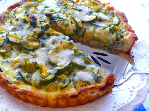 Unfold crescent dough from the tube and press dough evenly into the bottom and up the sides of tart pan to form a crust, pressing gently to seal any perforations; spread crust with pesto. (NOTE: If you will be using a shortcrust pastry recipe instead of the crescent roll dough, you will need to blind-bake it before adding the filling).