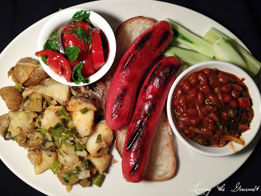Steak Dogs with Beans, Home Fried Potatoes and Tomato Salad