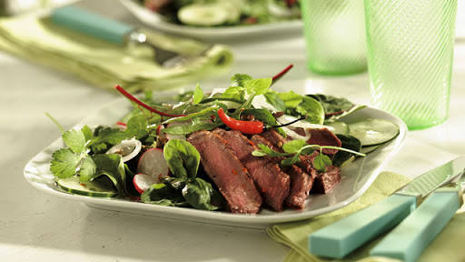 3. Add spinach, radishes, cucumber, mint, cilantro and onion to steak mixture; toss gently to coat.