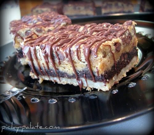 1. Make sure oven is preheated to 350 degrees F. In a stand or electric mixer cream the butter and sugars until well combined. Beat in eggs and vanilla until combined. Place flour, baking soda and salt into a large bolw; mix to combine. Slowly add to wet ingredients along with chocolate chips. Spoon 1/2 of the dough evenly over peanut butter cookie dough but don’t press, just leave uneven. Bake for 35-45 minutes or until center of dough is cooked mostly through. Edges will be brown. I covered pan with foil during the last 15 minutes of baking.