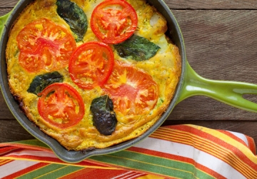 Place the skillet under the broiler and let cook for 3 to 5 minutes, or until the top is nicely browned. Check it every 2 minutes to be sure it doesn’t burn. Remove the frittata from the heat and garnish with basil leaves. Let set for at least 20 minutes before serving.