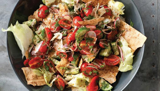 To make the dressing, combine all ingredients in a bowl or shake in a jar. Place all the prepared vegetables and herbs in a salad bowl. Sprinkle with the sumac and enough of the dressing to coat the leaves. Mix well. Add the bread and gently toss. Taste for seasoning and add more salt and pepper if needed. Sprinkle with the extra sumac to serve.