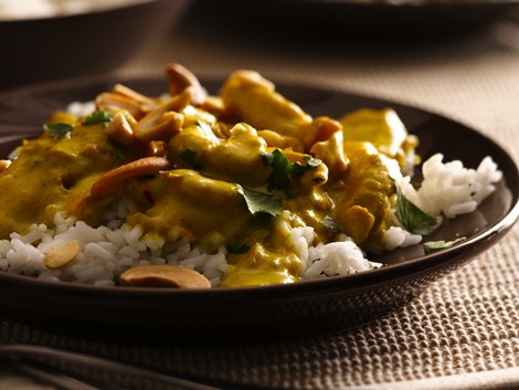 Serve chicken mixture over rice; sprinkle with cashews and cilantro.