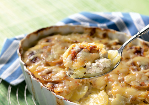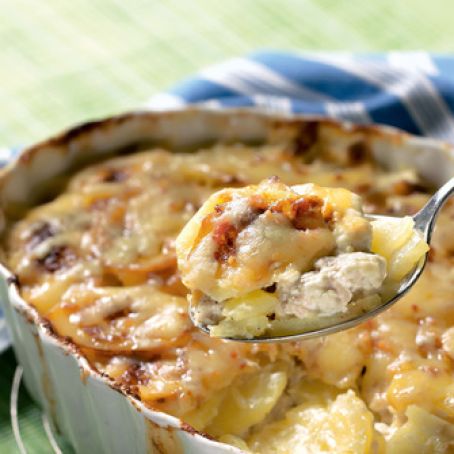 Whisk together milk or cream and mustard; pour evenly over casserole. Bake for 1 1/2 hours, or until potatoes appear to be melting into milk.