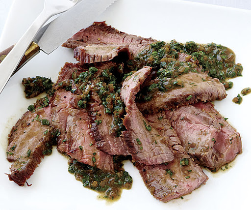 Cut the steak in half with the grain, then slice the meat on the diagonal across the grain into 1/8-inch slices. Serve with the sauce.