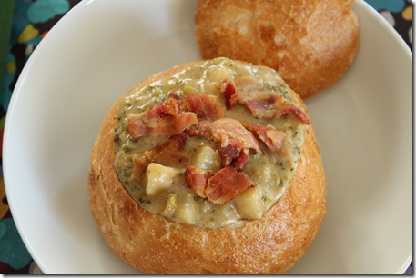 Vierta la sopa en el tazón de pan y adornar con un poco de tocino picado
