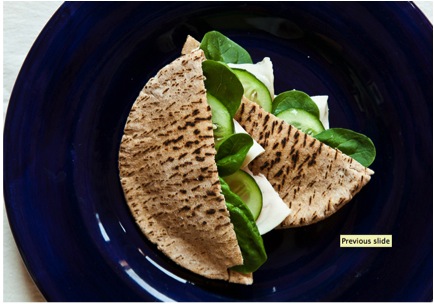 Spread a creamy cheese, such as Boursin, inside a whole wheat pita, then fill with roast turkey slices, baby spinach leaves and cucumber slices.
