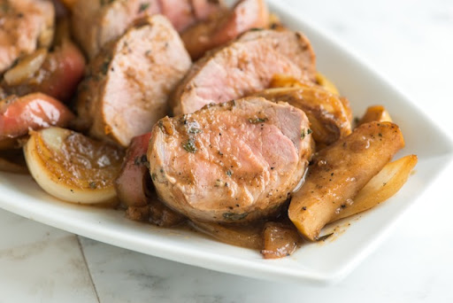 Slice pork into 1-inch slices then serve on a bed of the apples and onions with pan sauce drizzled on top.