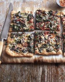 3.Stretch dough into a 10-by-14-inch rectangle and transfer to a piece of parchment. Brush with remaining oil and season with salt. Sprinkle with half the Gruyere, then top with chard and sprinkle with remaining Gruyere.