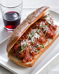 Add the meatballs to the sauce. Cover and cook on high for 1 hour longer, until no trace of pink remains in the center of the meatballs. Discard the basil sprig. Add 1 tablespoon of the sliced basil to the sauce and season with salt and pepper. Spoon the meatballs into bowls, sprinkle with the remaining 1 tablespoon of sliced basil and serve, passing grated cheese at the table.