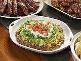 Scatter the cheese over the beans. Halve and seed the avocados, then mash with the jalapeno and another teaspoon of salt in a small bowl. Spread a layer of the avocado over the cheese, and then scatter the lettuce on top.