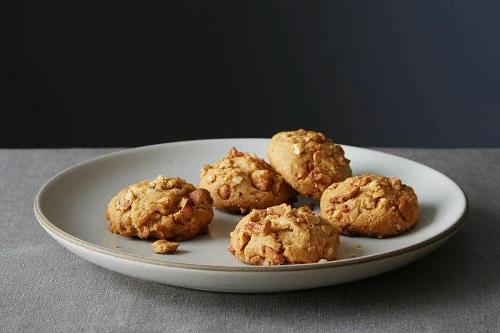 - Pour the chopped nuts into a shallow bowl. Scoop about 2 level teaspoons of dough for each cookie, shape into a 1-inch ball or a fat little log, and coat the top and sides heavily with the chopped nuts, pressing in any pieces that fall off so that there are no bald spots. Place 2 inches apart on the lined baking sheets. If you like, sprinkle each cookie with a very tiny pinch of crushed flaky sea salt.