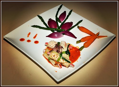 - Coloque en el vaso de la licuadora el pimentón rojo asado, vino blanco, aceite de oliva, sal, pimienta y vinagre blanco, licue y cuele. Coloque la salsa obtenida en una cacerola y lleve al fuego, una vez caliente incorpore una cucharada de mantequilla fría, mezcle hasta emulsionar. - Rellene los tubos de calamar con la cebolla caramelizada, un trozo de queso y por ultimo uno o dos espárragos, ate con una tira de cebollín.