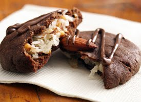 3. For each cookie, press 1 rounded tablespoon dough into 3-inch round. Place 1 tablespoon coconut mixture on center of each round. Wrap dough around filling, pressing edges to seal; shape into a ball. Place balls 3 inches apart on ungreased cookie sheets. Press each ball with fingers into 2 1/2-inch round. Press 1 whole almond on each cookie.