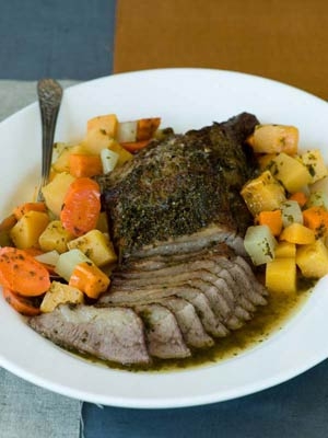 Remove brisket to a cutting board and let it rest for 15 minutes. Scoop vegetables out of the roasting pan and onto a platter, cover to keep warm. If there is a lot of fat in pan juices, skim it off. Slice brisket across grain (muscle lines) at a slight diagonal. Serve with vegetables and pan juices poured over sliced meat.