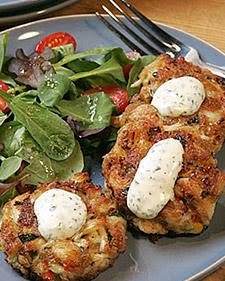 1. Preheat oven to 250 degrees. In a large bowl, combine crabmeat, breadcrumbs, mayonnaise, eggs, peppers, cilantro, and scallions; mix well. Season with salt and pepper. Shape mixture into twenty-four 2-inch-round patties.