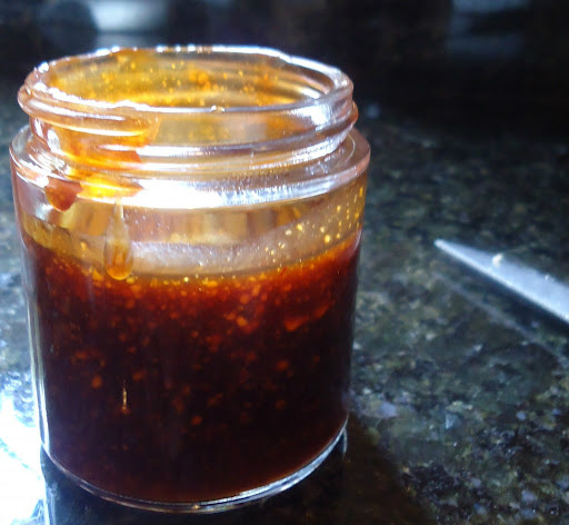 Slowly thin the orange marmalade with the orange juice until it reaches desired consistency. Then stir in the mustard and the dried chili flakes.