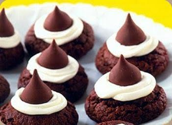 *3*. Bake 8 to 10 minutes or until set. Cool 1 minute; remove from cookie sheet to wire rack. Cool completely. Spread frosting onto cookies, leaving about 1/2-inch around outer edge unfrosted; place chocolate piece in center of each cookie.