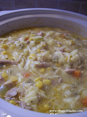 Add everything but the noodles and cooked chicken to the crock pot on Low for 5-6 hours, the last hour turn on High, and add noodles and chicken.