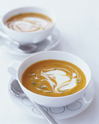 In a medium soup pot, melt the butter in the olive oil. Add the sliced carrots, sliced onion and grated ginger, cover and cook over moderately high heat for about 8 minutes, stirring the vegetables occasionally, until just beginning to soften. Add the vegetable stock and nutmeg to the vegetables and season liberally with salt and pepper. Cover and cook the soup over moderate heat until the carrots and onions are very soft, about 10 minutes.