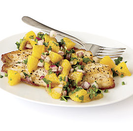 Pat the fish dry and season with salt and pepper. Heat the oil in a 10-inch nonstick skillet over medium-high heat until shimmering hot. Cook 2 of the fillets, flipping once, until browned and just cooked through, 1-1/2 to 2 minutes per side. Transfer to dinner plates. Repeat with the remaining fillets. Using a slotted spoon to drain excess juice, top the fish with the salsa and serve.