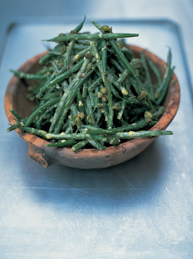 Remove one of the beans from the pan to check if it's cooked. If it holds its shape but is also soft to the bite, it's perfect. Drain in a colander. Now, while the beans are steaming hot, this is the perfect moment to dress them – a hot bean will take on more of the wonderful dressing than a cold one. It is best to serve the beans warm, not cold.