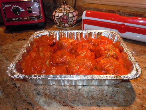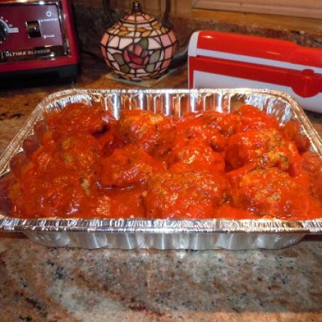 Form the meatballs into 7 to 8-ounce portions, just bigger than a baseball but not as big as a softball, and put them into a 2-inch deep baking pan. Be sure the sides do not touch to ensure even cooking. Bake until the meatballs reach an internal temperature of 165 degrees F on an instant-read thermometer, about 1 hour to 1 hour and 10 minutes. Transfer the meatballs to a serving platter and serve.