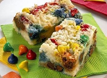 *2*. Stir together coconut, sugar, flour and salt in large bowl. Add egg whites, egg and almond extract; stir until well blended. Stir in candies. Spread mixture in prepared pan.