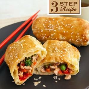 Stir the vegetables, chicken and hoisin sauce in a medium bowl. Spoon about 1/4 cup vegetable mixture on the lower third of each pastry square. Fold 2 sides over the filling and roll up like a jelly roll. Place the filled pastries seam-side down onto a baking sheet. Brush the pastries with the egg and sprinkle with the sesame seeds, if desired.
