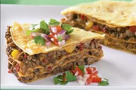 Place one tortilla in a 9-in. round baking pan coated with cooking spray. Layer with half of the meat sauce, one tortilla, all of the ricotta mixture, another tortilla and the remaining meat sauce. Top with remaining tortilla; sprinkle with cheddar cheese and remaining cilantro.