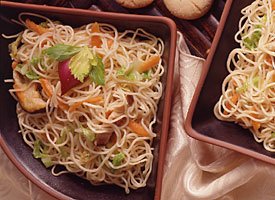 1.Cook and drain noodles as directed on package. Toss noodles and sesame oil. Mix sherry, oyster sauce, sugar and pepper.