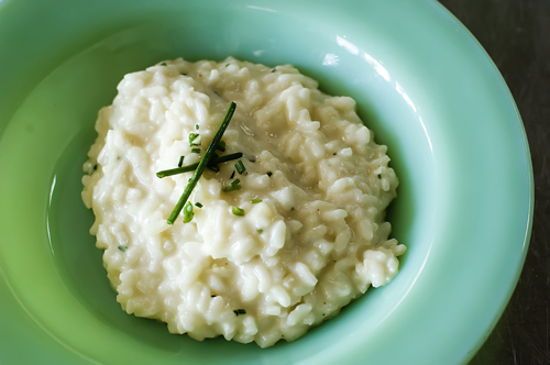 When more of the broth is absorbed pour in 1 to 1 ½ cups of heavy cream. Next add the grated cheese and stir thoroughly. Add in plenty of fresh cracked pepper and about 1 to 2 tablespoons of chopped chives. Add salt to taste.