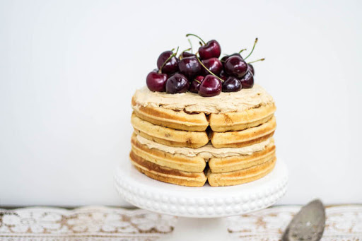 Once waffles are cooled, stack two of them to form the first layer of the cake, slather with the buttercream, top with two more waffles and then another layer of buttercream. Finish with fresh fruit.