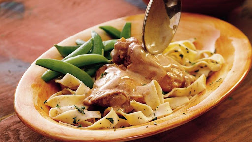 4. Remove chicken and onion from cooker, using slotted spoon. Place on serving platter; cover to keep warm. In small bowl, mix cornstarch and water; stir into juices in cooker. Increase heat setting to High. Cover; cook about 10 minutes or until thickened. Stir in potato topper. Pour sauce over chicken. Serve over noodles.
