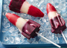 1.In blender, place red layer ingredients. Cover; blend until smooth. Spoon 2 tablespoons mixture into each of 6 (5-oz) paper cups. Cover cups with foil; insert craft stick into center of each pop. (Or fill ice pop molds according to manufacturer’s directions.) Freeze about 2 hours or until frozen.