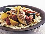 To serve, spread the couscous over a large serving platter and, using a slotted spoon, mound the vegetables in the center. Pour some of the broth over the vegetables and sprinkle with the almonds. Pass the remaining broth and the harissa, if desired, at the