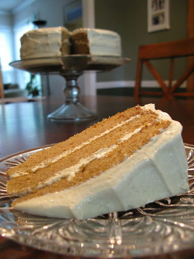 7. Place the first cake layer on your serving dish, cover the top in frosting, add the second layer, cover it with frosting, add the third layer, cover the whole cake with frosting (you should have enough). Dust with cinnamon or nutmeg if desired.