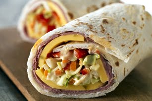 TOPtortilla with meat, cheese, coleslaw and peppers; roll up.