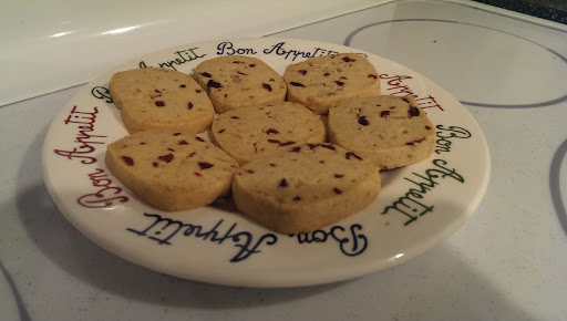 In large bowl, with mixer on medium speed, beat butter and sugar 1 minute or until creamy, occasionally scraping bowl with rubber spatula. Add egg and vanilla; beat until well mixed. Reduce speed to low; gradually beat in flour mixture just until blended, occasionally scraping bowl. Along with the flour mixture now is the time to add the cranberries, ginger, zest and spice.