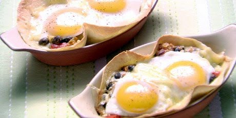 5. Grease 6 8-ounce ovenproof dishes and line each with a tortilla. Spoon ranchero mix into each tortilla and sprinkle with grated cheddar. Break 2 eggs into each dish and season lightly.