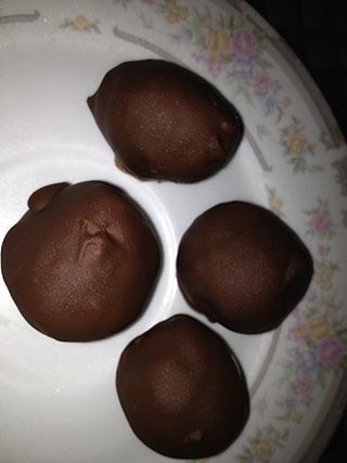 - I dip these chocolates in melted milk or dark chocolate. The original recipe calls for one cake of wax and 2 cups of chocolate chips. Melt these items together, stirring constantly, and dip candies.