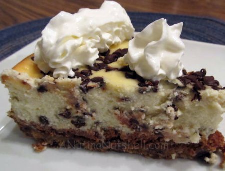 4. Toss 1/3 of the miniature chocolate chips with 1 tsp flour to coat. (Prevents them from sinking to the bottom of the cheesecake). Mix into cream cheese mixture. Pour into prepared crust.