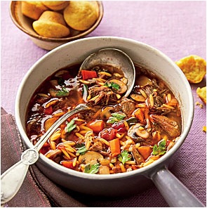 Sauté onion in hot oil in a Dutch oven over medium-high heat 5 to 6 minutes or until lightly browned. Add carrots and mushrooms, and cook, stirring occasionally, 8 to 10 minutes or until mushrooms are tender. Add remaining ingredients, and bring to a boil. Reduce heat to medium, and simmer, stirring occasionally, 5 to 6 minutes or until orzo is al dente and soup is thoroughly heated.