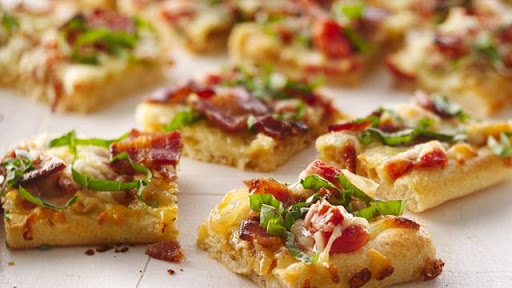 This delicious Caramelized Onion & Peppered Bacon Flatbread recipe makes the perfect finger food, just cut them into 2 inch squares and watch how fast they disappear!